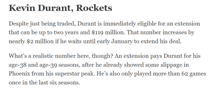 尽管杜兰特很出色,但预计他在这两个赛季仍能拿到顶薪是不现实的。霍林格预测他下赛季的身价为4300万美元,而这份续约合同涵盖了之后的两个赛季,届时年龄想必对杜兰特不会有利。